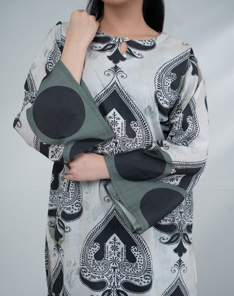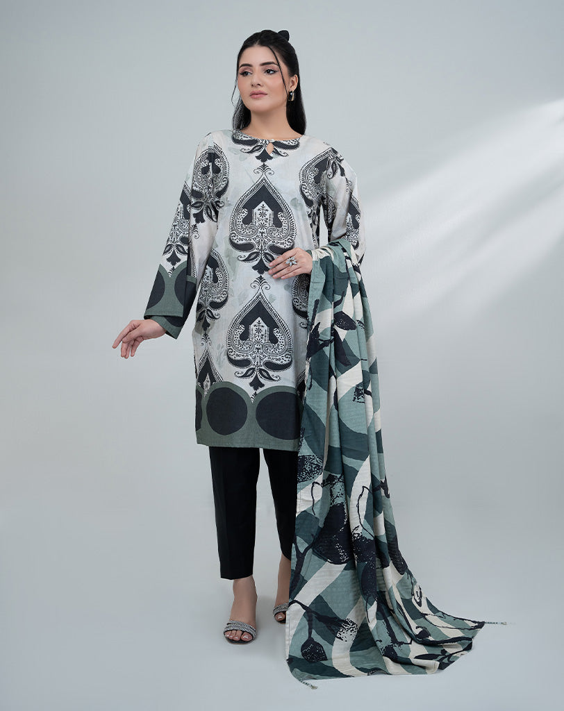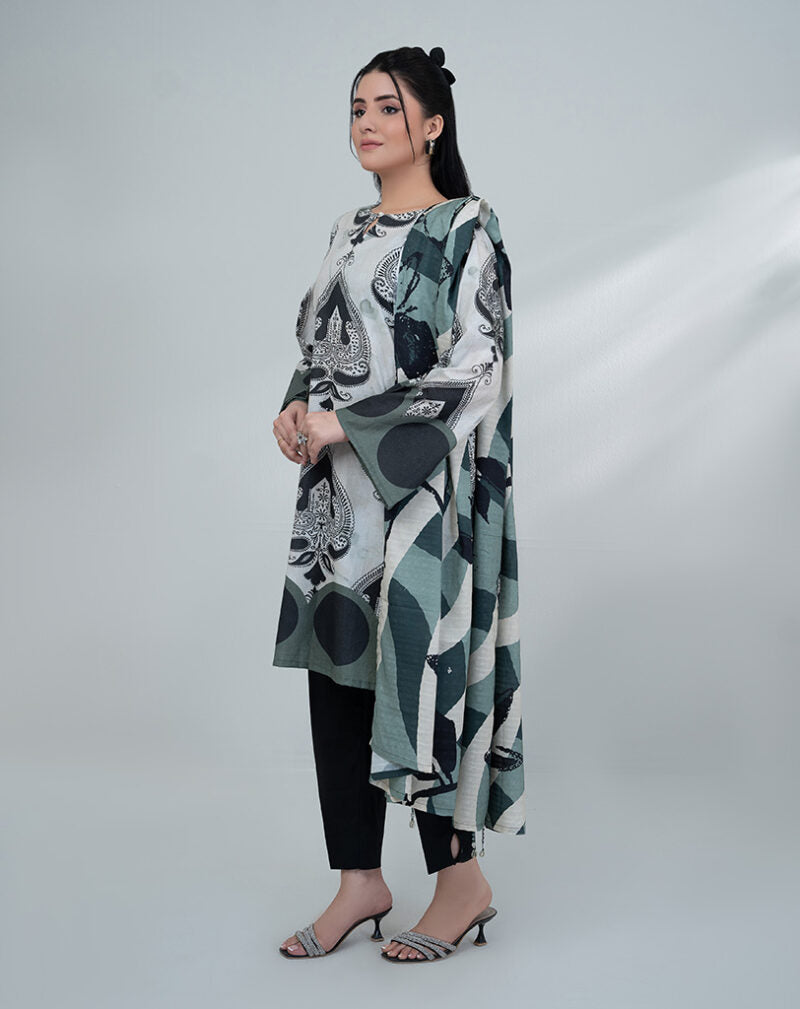Creat the perfectlook with our green three-piece suit, featuring a round neck paired printed khaddar dupatta