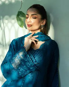 Seri brings calm sophistication in a refreshing blue hue. This straight-cut shirt features a detailed patch neckline and is finished with an organza border on both the sleeves and shirt hem. Subtle sequence and rasham viscose thread embroidery add texture and elegance, making Seri a timeless addition to your wardrobe.