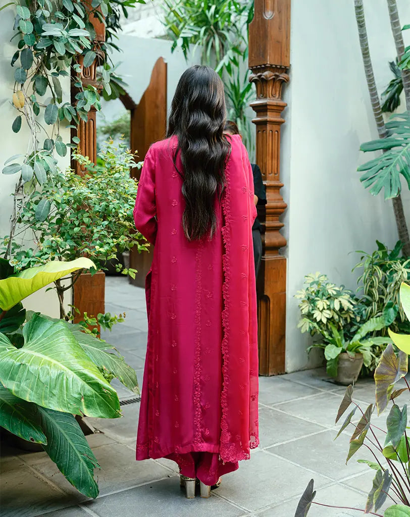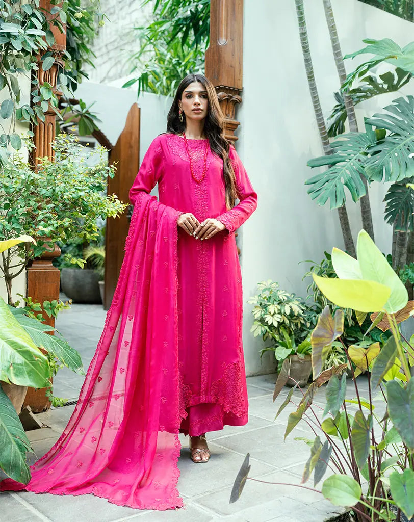 Zaya is a graceful front-open silhouette in pink, detailed with machine embroidery using rasham viscose thread and delicate sequins. The neckline features patchwork detailing that flows down the front, complemented by an appliqué patch on the sleeves and a refined patch border on the shirt hem. A perfect blend of modern charm and feminine elegance.