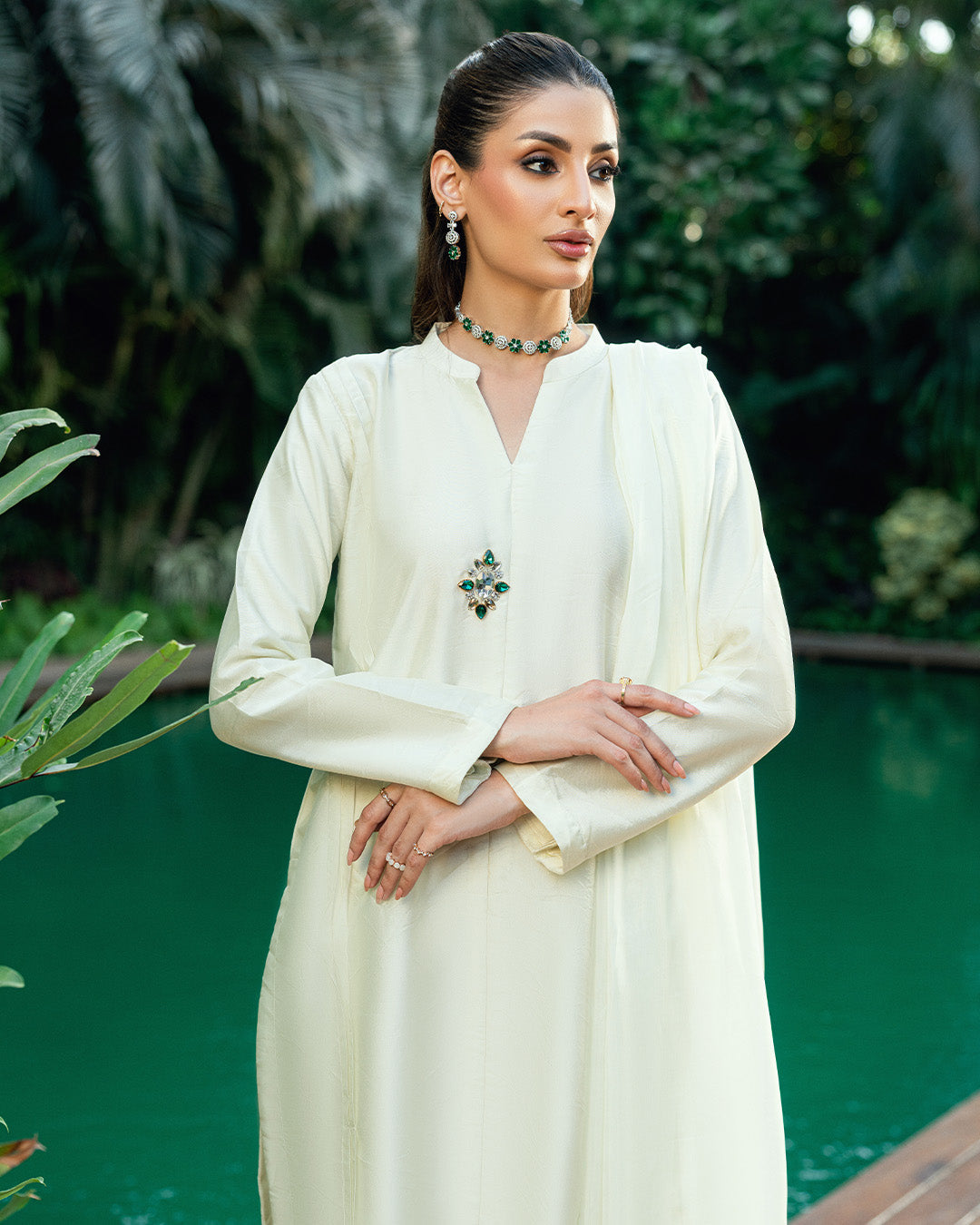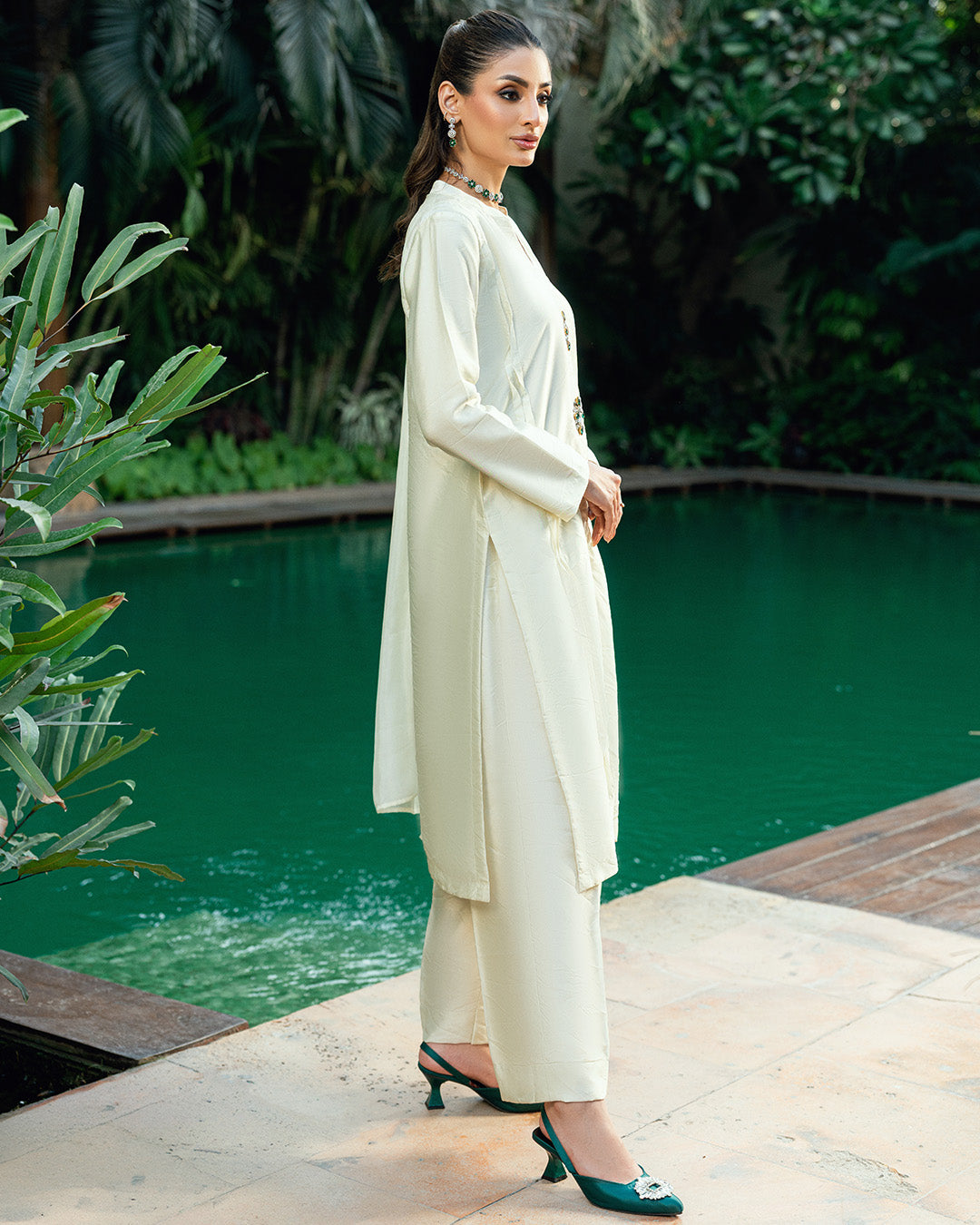 Elevate your festive wardrobe in our Hand Embellished sheesha silk Suit A-line shirt with a drop-neckline.