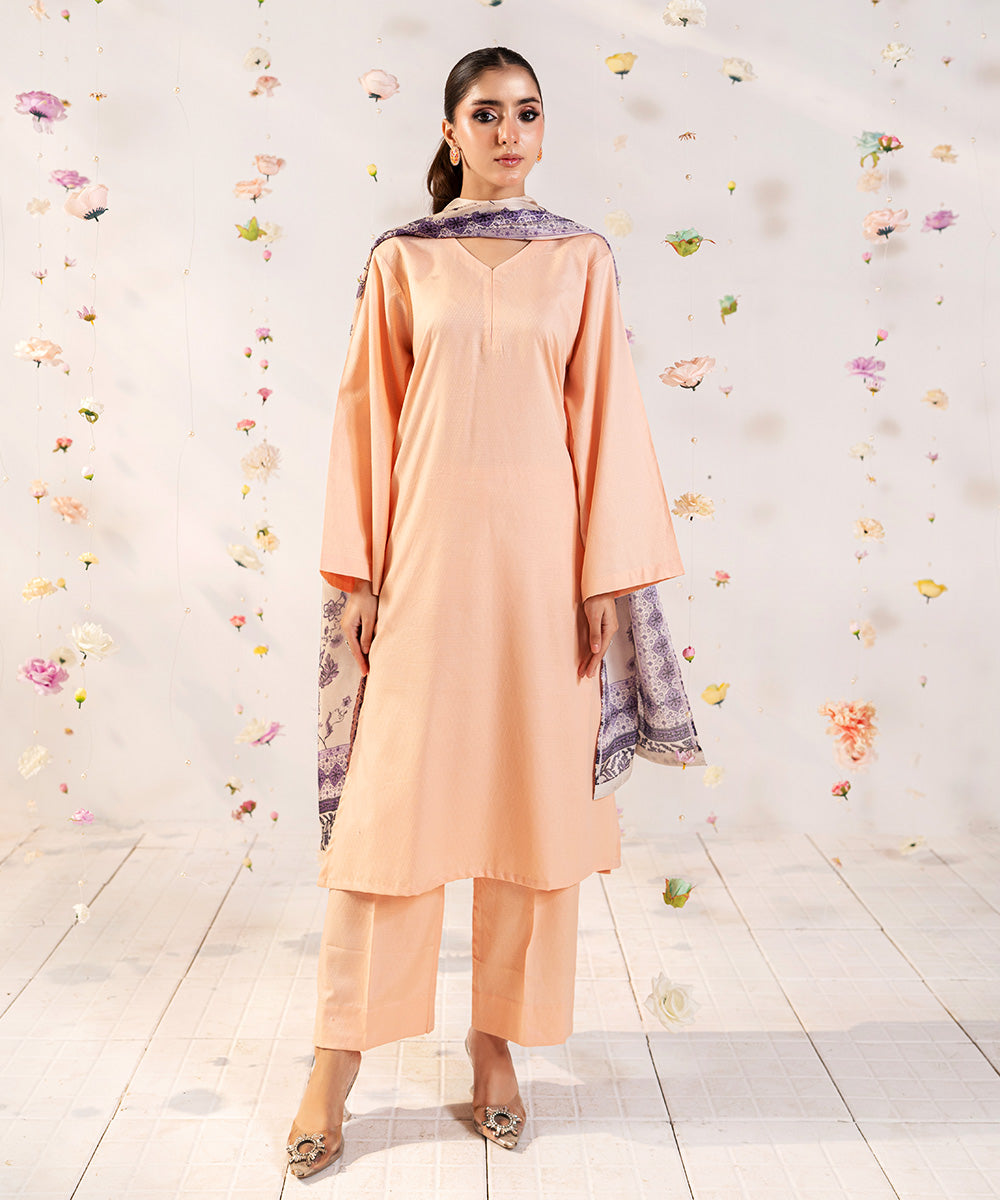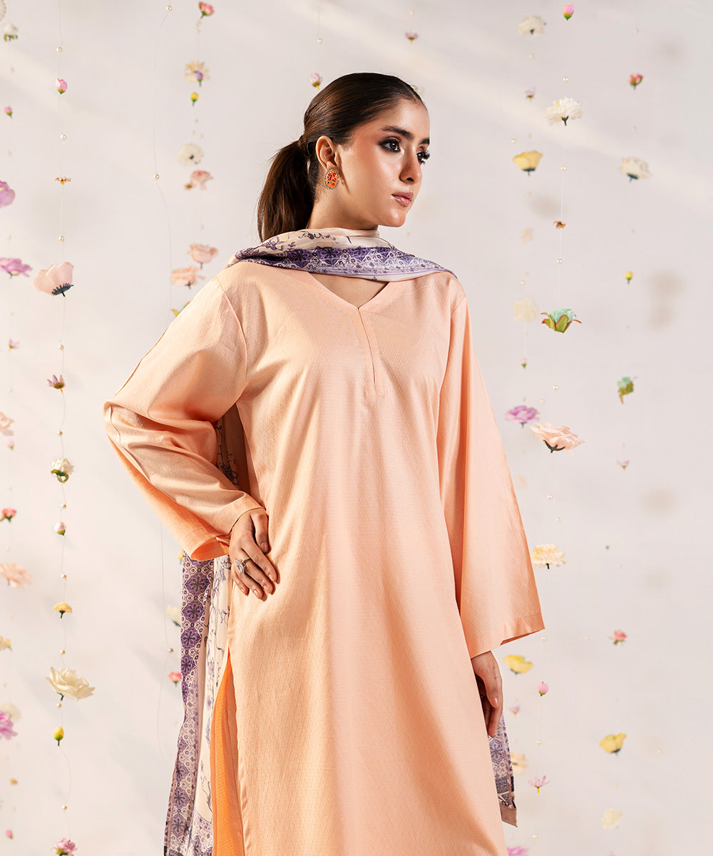 Perfect your style in our dyed Peachy pink arabic self jacquard straight shirt featuring a v neckline. Elevate your style with our stunning Elegant solid suit